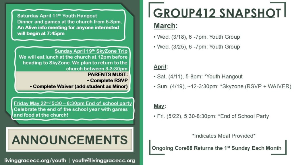 Welcome to Living Grace Youth Group (called Group 412 inspired by 1 Timothy 4:12). We strive to create a welcoming space for 6th-12th Grade youth and are dedicated to helping them grow in their faith and live as examples of Christ!