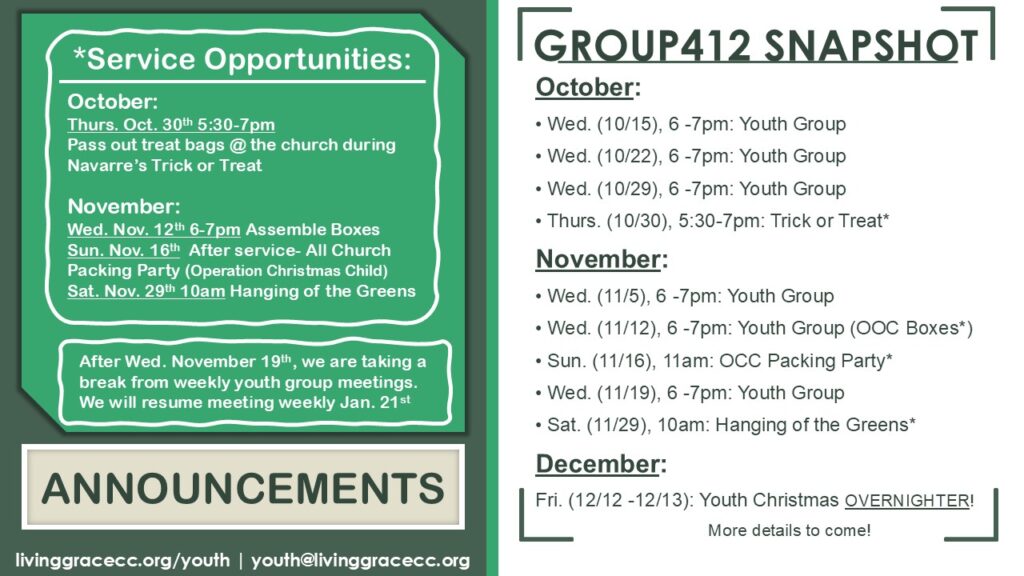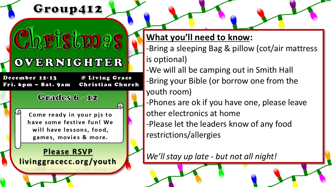 Welcome to Living Grace Youth Group (called Group 412 inspired by 1 Timothy 4:12). We strive to create a welcoming space for 6th-12th Grade youth and are dedicated to helping them grow in their faith and live as examples of Christ!